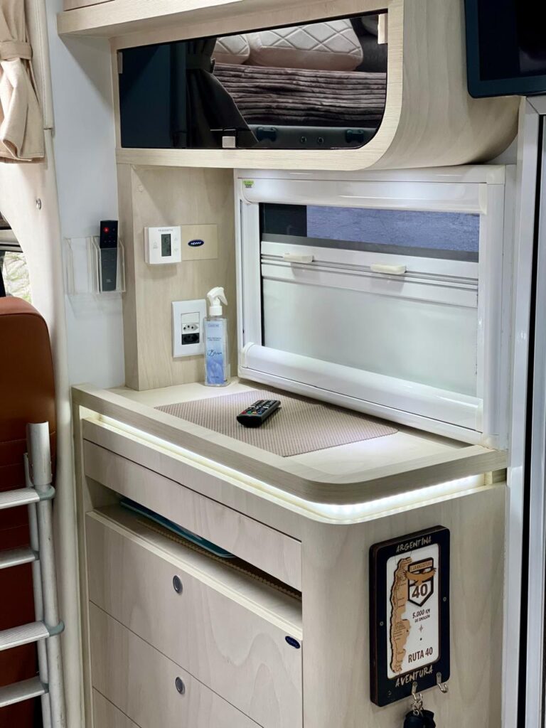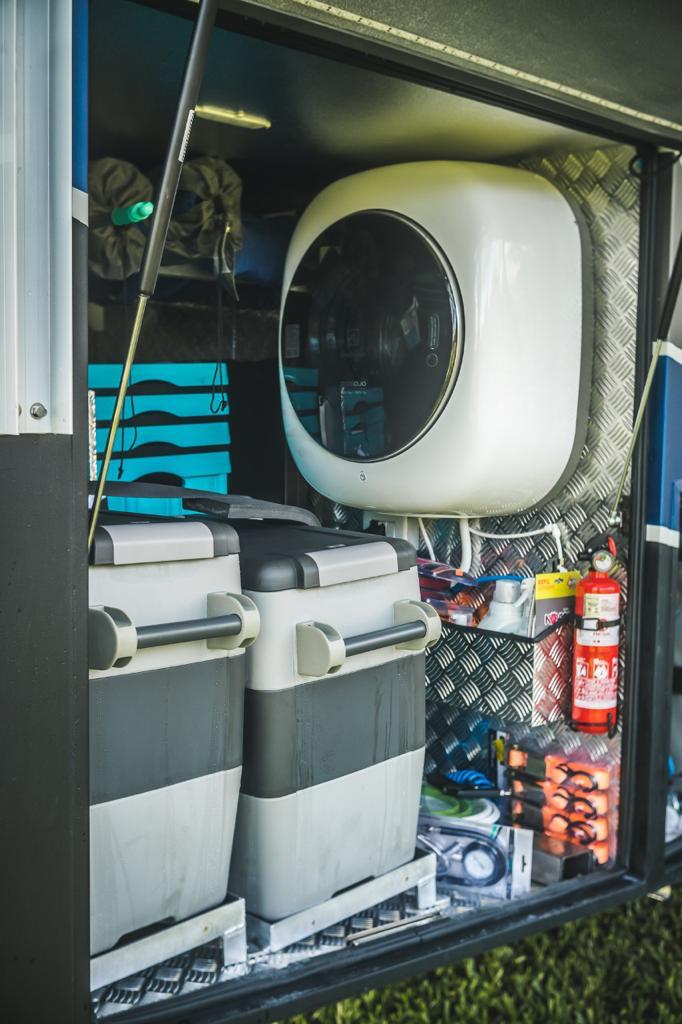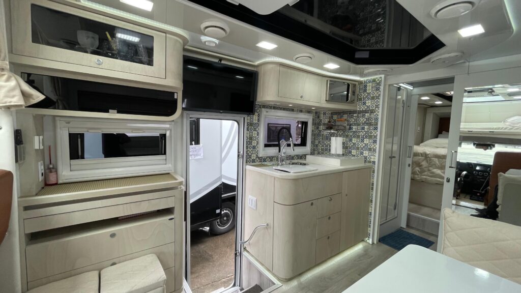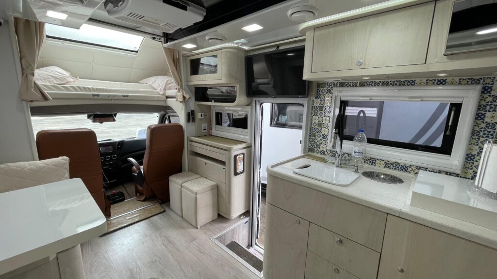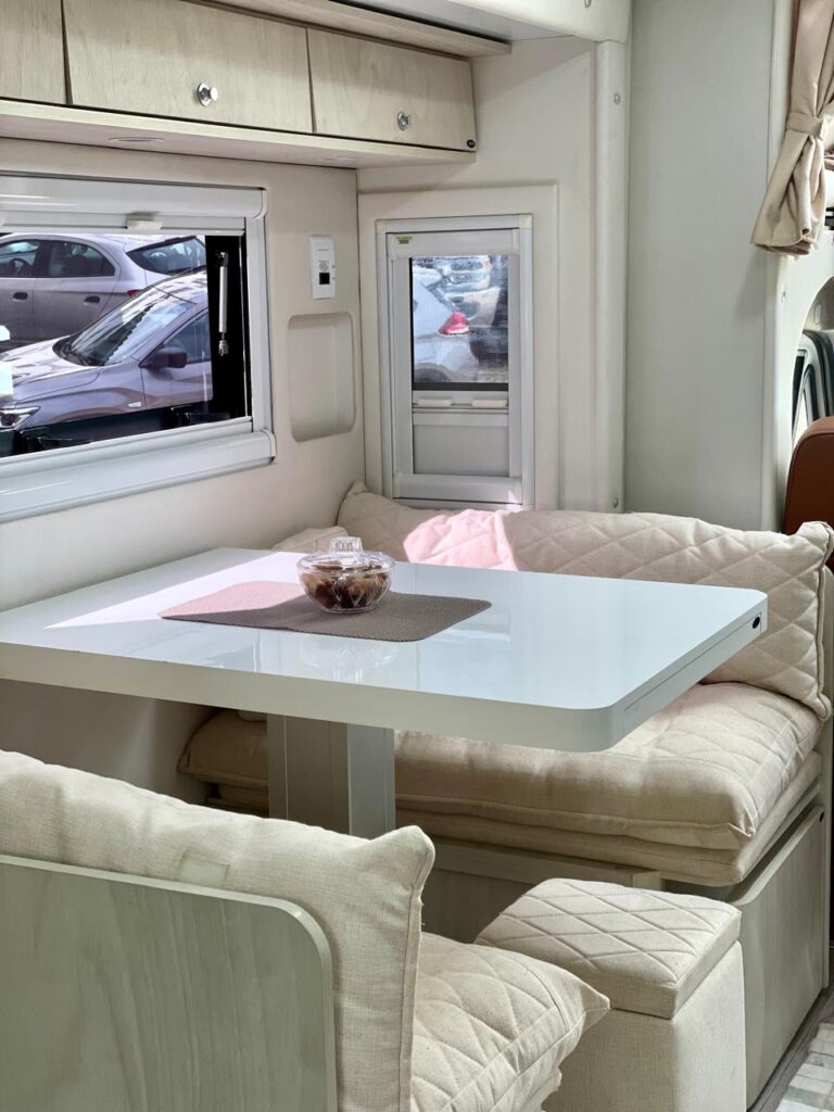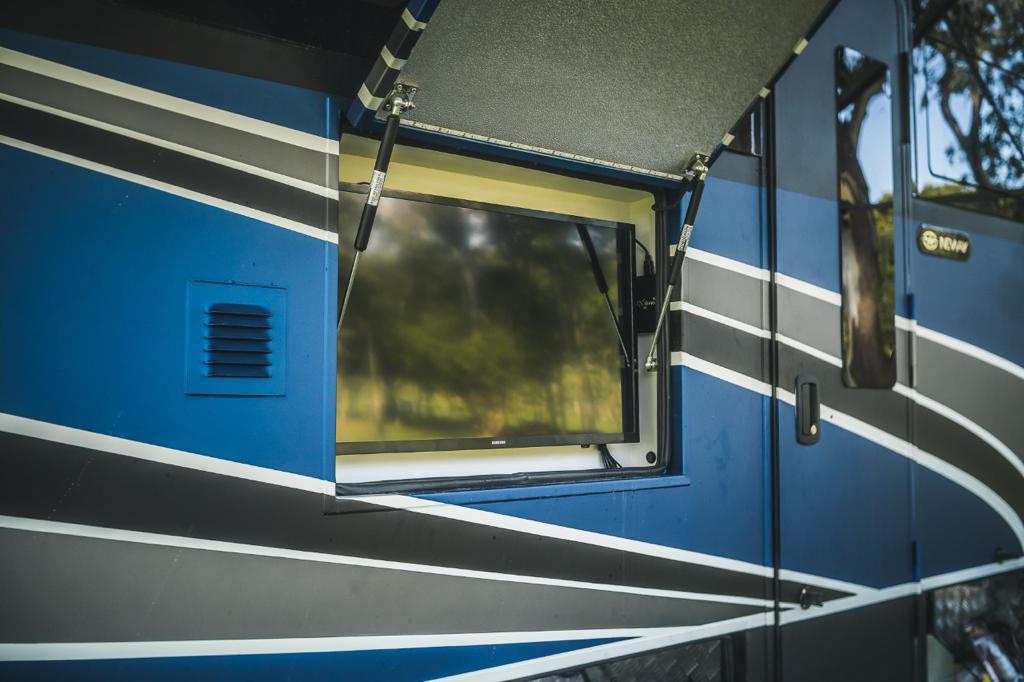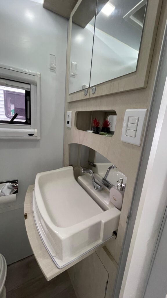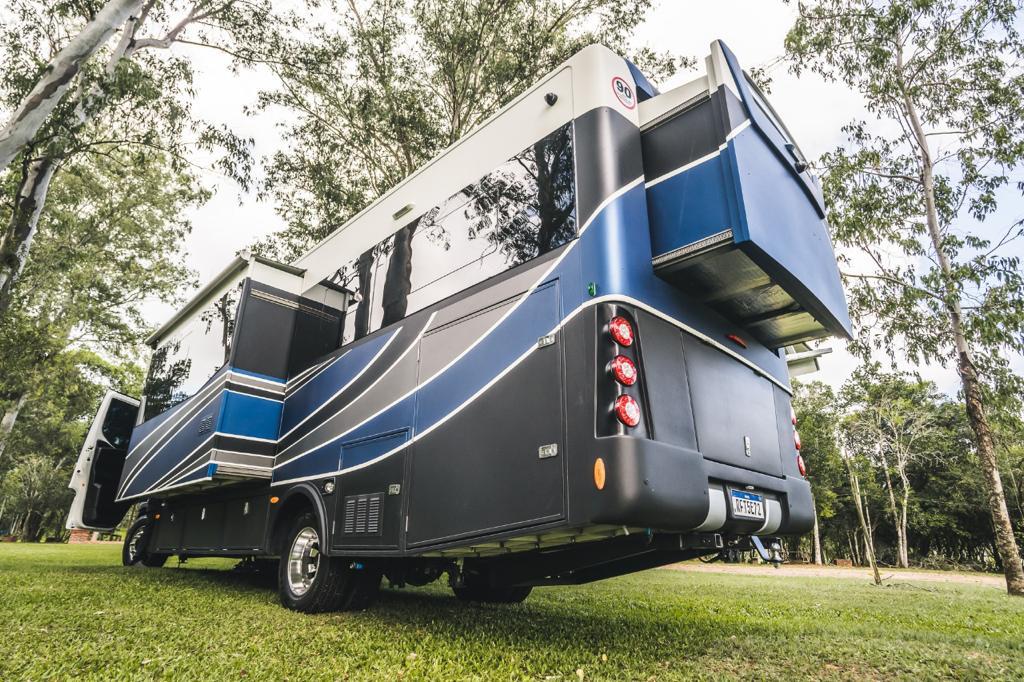 Tv smart quarto e área externa com mesa auxiliar; Engate de reboque removivel; Chuveiro externo PVC com porta e chave, janelas basculantes com blackout e mosquiteiro, Slide-Out na sala e quarto, estrutura em alumínio, Sistema de placa fotovoltaica 280w com computador de bordo: Máquina lavar e seca 3kg Electrolux, Cozinha externa com fogão e cuba, tampa vira mesa;
