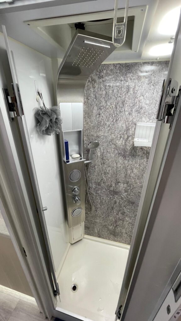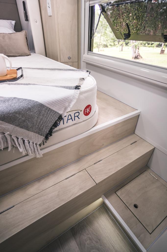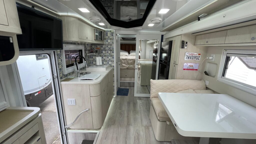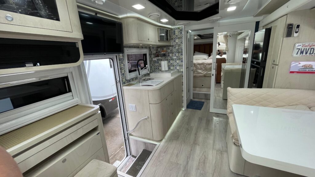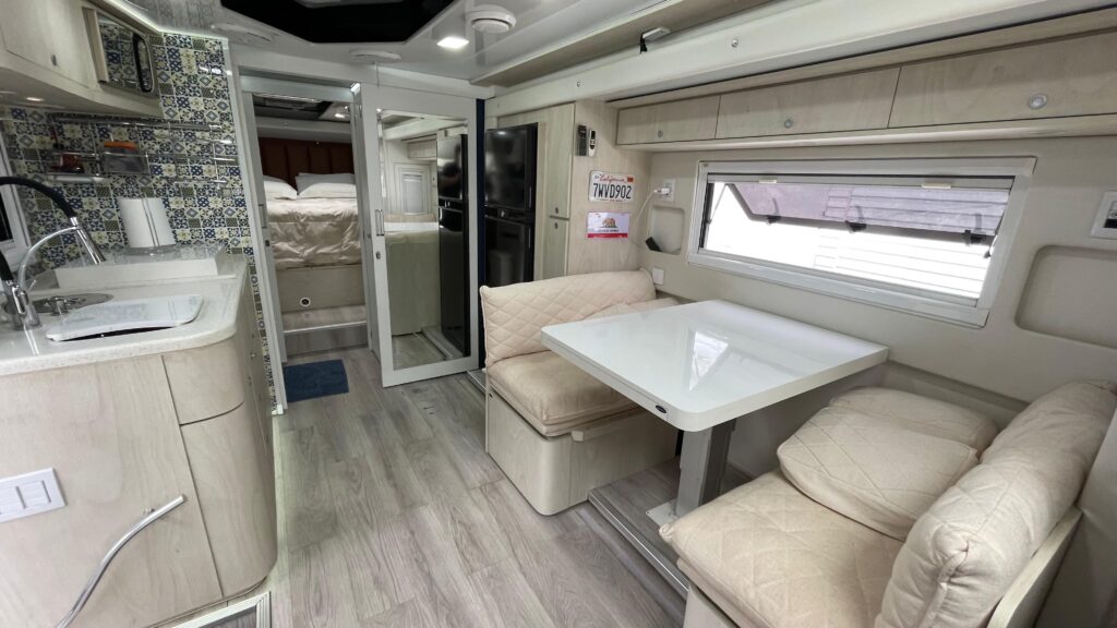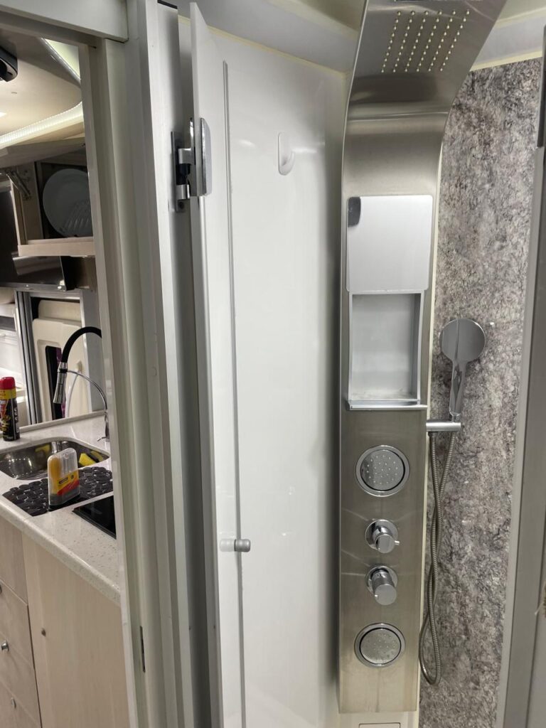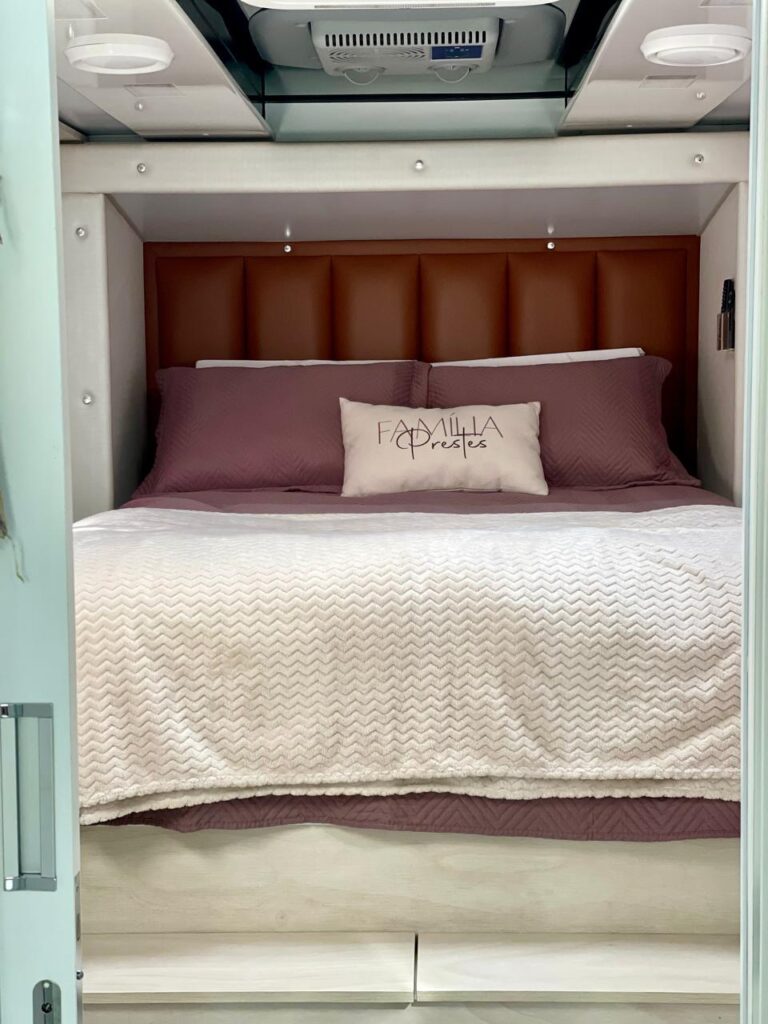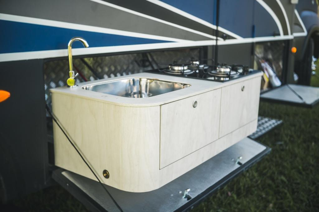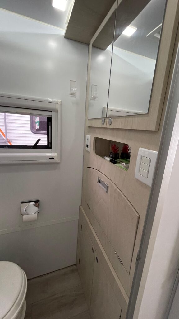 Tv smart quarto e área externa com mesa auxiliar; Engate de reboque removivel; Chuveiro externo PVC com porta e chave, janelas basculantes com blackout e mosquiteiro, Slide-Out na sala e quarto, estrutura em alumínio, Sistema de placa fotovoltaica 280w com computador de bordo: Máquina lavar e seca 3kg Electrolux, Cozinha externa com fogão e cuba, tampa vira mesa;